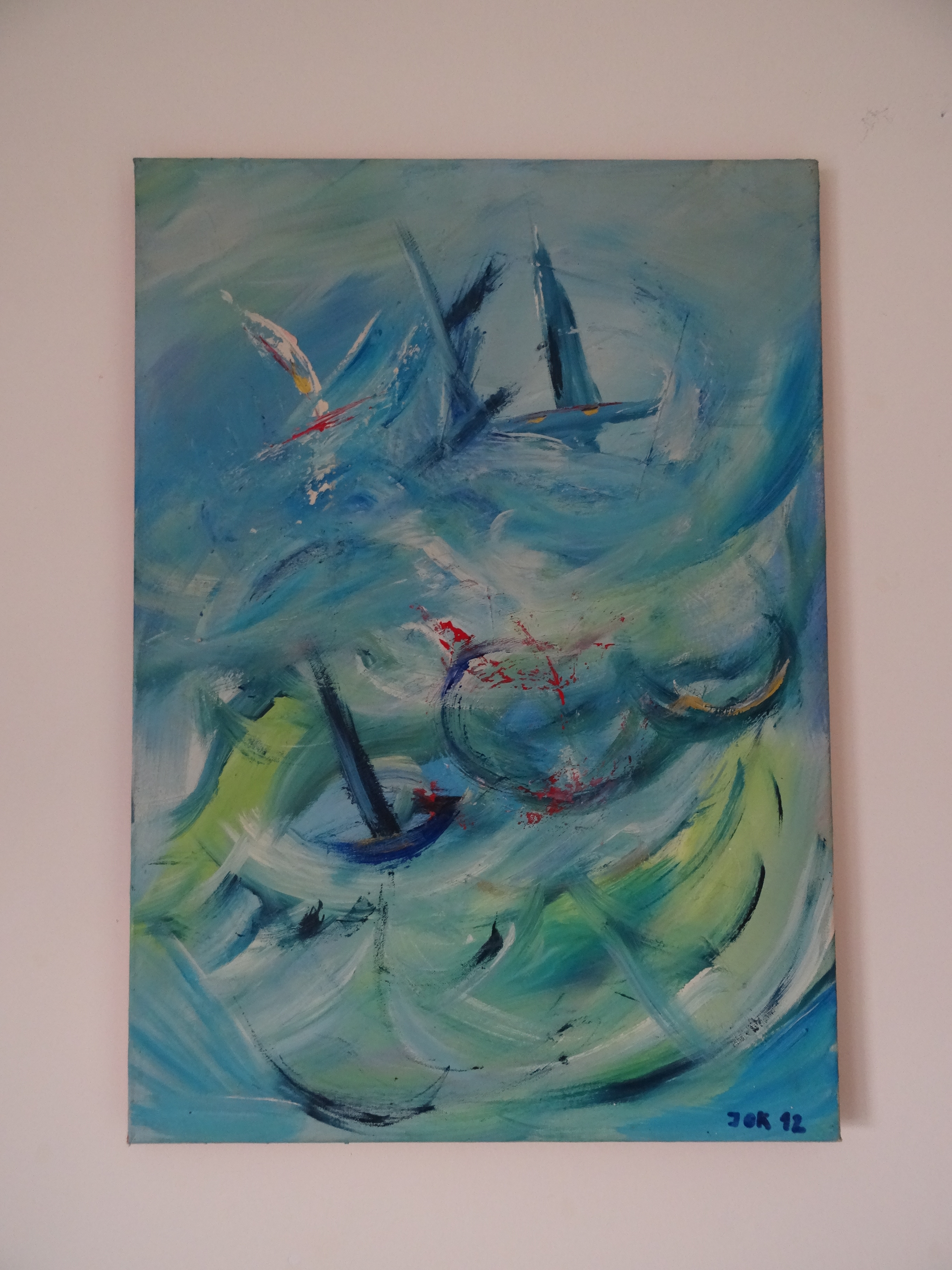 Tror att hon kallar tavlan ”båtar i storm på Libyska havet” men jag ser både båtar och fåglar. Och inte nödvändigtvis storm.