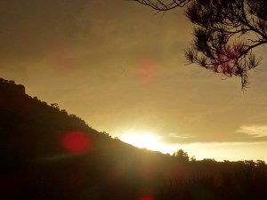 Frukost strax efter 7. Solen på väg upp över bergen. Låga, mörka moln förs fram över himlen av sydvästlig vind. Bergssluttningen bakom mig glöder när solljuset når dit. Fåglar kvittrar. Vattenporl från vattenfallet som bakgrundsljud. I övrigt tystnad. Ganska naturlig och självklar fråga dyker en upp: vad kan man mer önska sig?