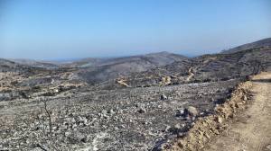 Jag har nog aldrig sett något så totalt avbränt här nere. Det brukar stå kvar några förkolnade trädskelett och lite andra rester. Här är det bara tomt! Många tycker att det är förfärligt med tanke på naturen, men den kommer tillbaka. Det som är katastrof är de odlingar som alltså försvann på 24 timmar. Södra Chios’ viktigaste inkomstkälla är mastix som är ett träd eller en buske. Genom att rista i barken får man fram flytande harts som används medicinskt och i lacker. 90 % av matrixträden vid tre byar brann upp, vid tre andra byar brann också ett stort antal.