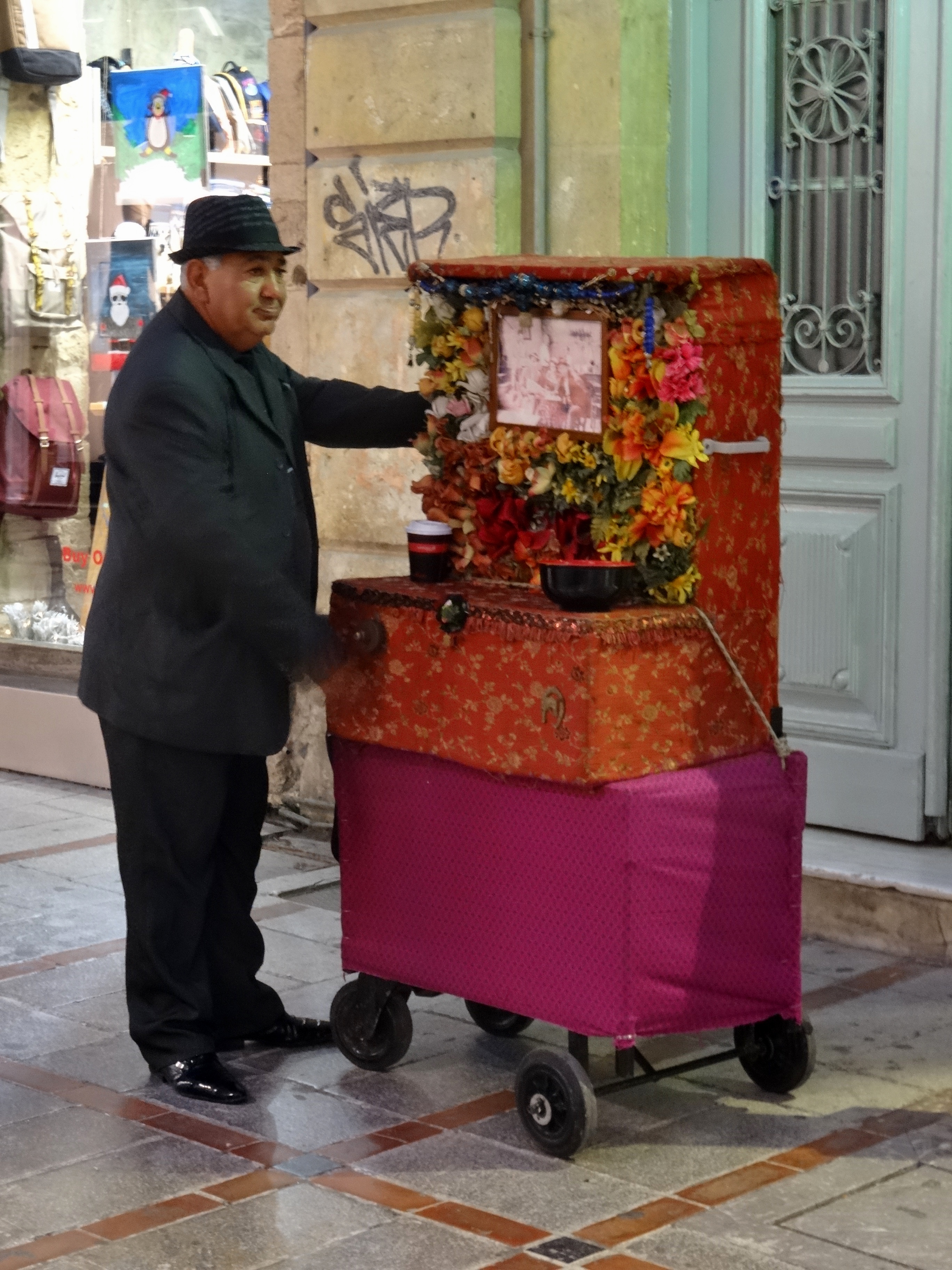 Så började det skymma och det blev dags att ge sig ut på stadens gator och torg. Affärerna var öppna, fint i skyltfönstren och mycket rabatter. Började med en sväng om basaren som var nästan folktom och inga juleljus. Blev full i skratt för jag tror att sommarturisterna skulle bli väldigt förvånade över utbudet av vantar, mössor, kängor, skinnjackor, halsdukar.