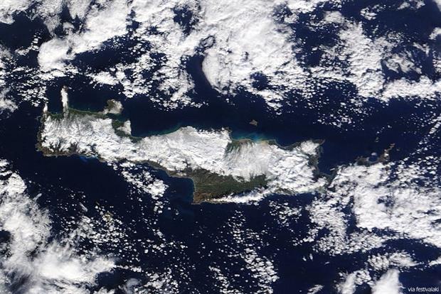 Satellitbild som visar snöläget på Kreta 9 jan. Redan dagen efter såg det annorlunda ut längs kusterna. Foto hämtat från neakriti.gr