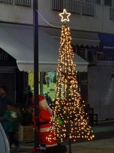 Vi fortsätter mot centrum och stöter på granar lite varstans. Och titta! Där är en så’n där invasionsplasttomte! Jag sa ju det, de dyker upp överallt.