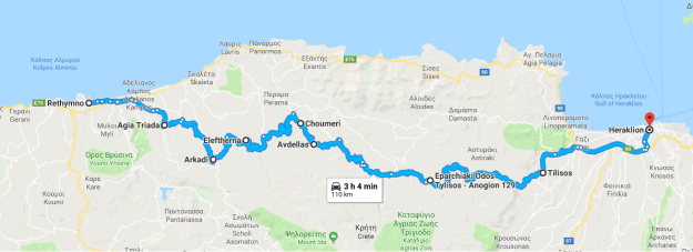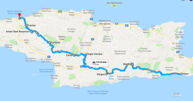 Jag kom iväg lite sent från Ierapetra så några stopp fick jag avstå eftersom jag ville vara i Rethymno innan det blev mörkt. Ungefär så här körde jag: