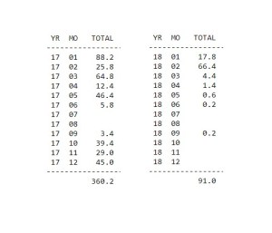 Jag har under året skrivit mycket om torka och att det i maj/juni konstaterades att vi (Ierapetra, alltså) har den värsta vattensitutionen på 40 år. Kanske lite siffror kan vara av intresse? År 2017 till vänster och år 2018 till höger (mo=month och regnmängd är i mm).