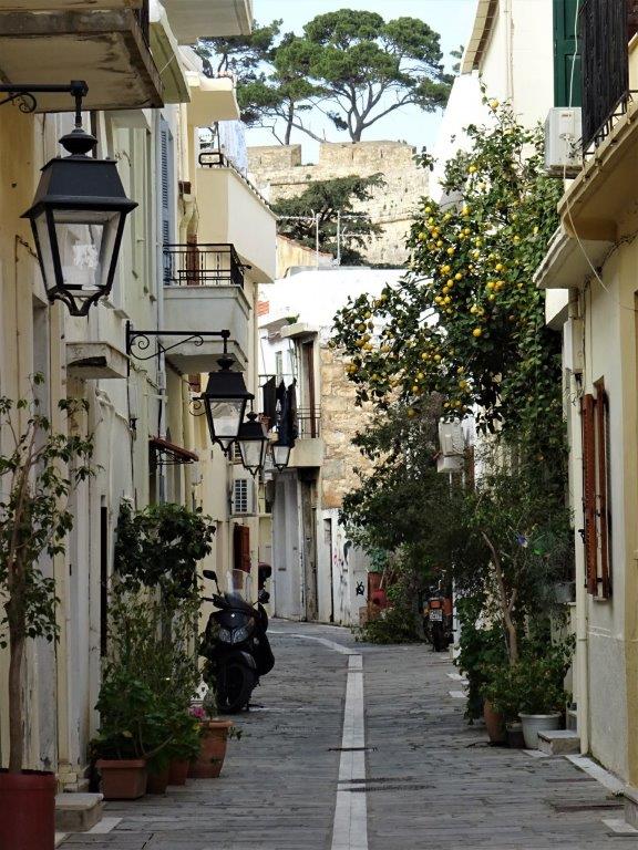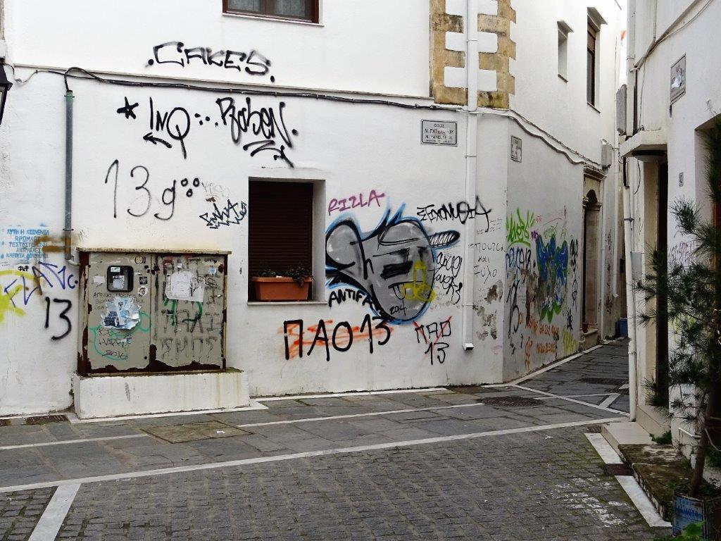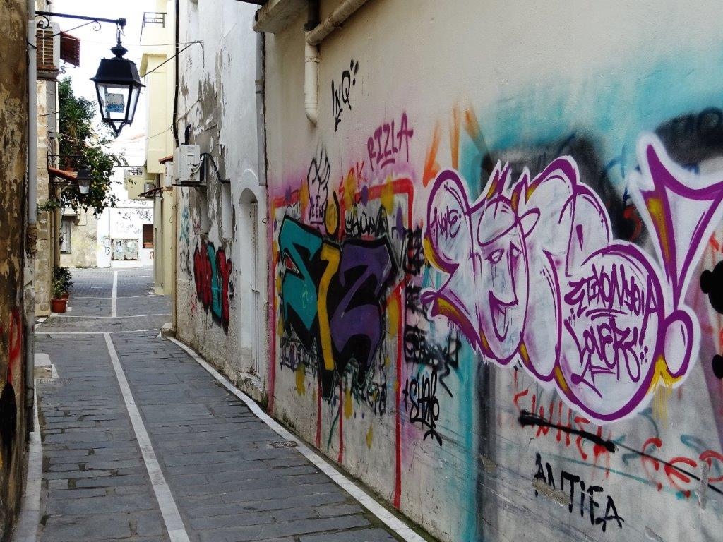 Jag kan inte riktigt bestämma mig för vad jag tycker om Rethymno. Jag tror att det är en stad som inte riktigt kommer till sin rätt under vintermånaderna. Förberedelser för karnevalen var igång med vimplar och diverse figurer uppställda längs med gator och på torg. Gamla sta’n i Rethymno (och också i Chania, tycker jag) har en byggnadsstil som saknas hos de fyra andra städerna på Kreta. Jag tycker om gränderna och gångarna, jag tycker om jordfärgerna men tycker också att de gör att det blir lite mörkt och dystert på vintern. En sak gör mig ledsen och jag förstår inte att man vill bo i det – allt klotter. Och det är inte en liten tagg här och en annan där utan mycket klotter och vanligt förekommande. Så här kan en fin gränd se ut i gamla sta’n: