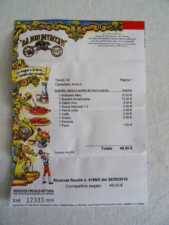 Middag: Ristorante da Meo Patacca, Piazza dei Mercanti, Trastevere – märklig inredning och personalklädsel, men god mat. Och det vackraste kvitto jag nå’nsin sett! Och varför ska inte kvitton vara vackra?
