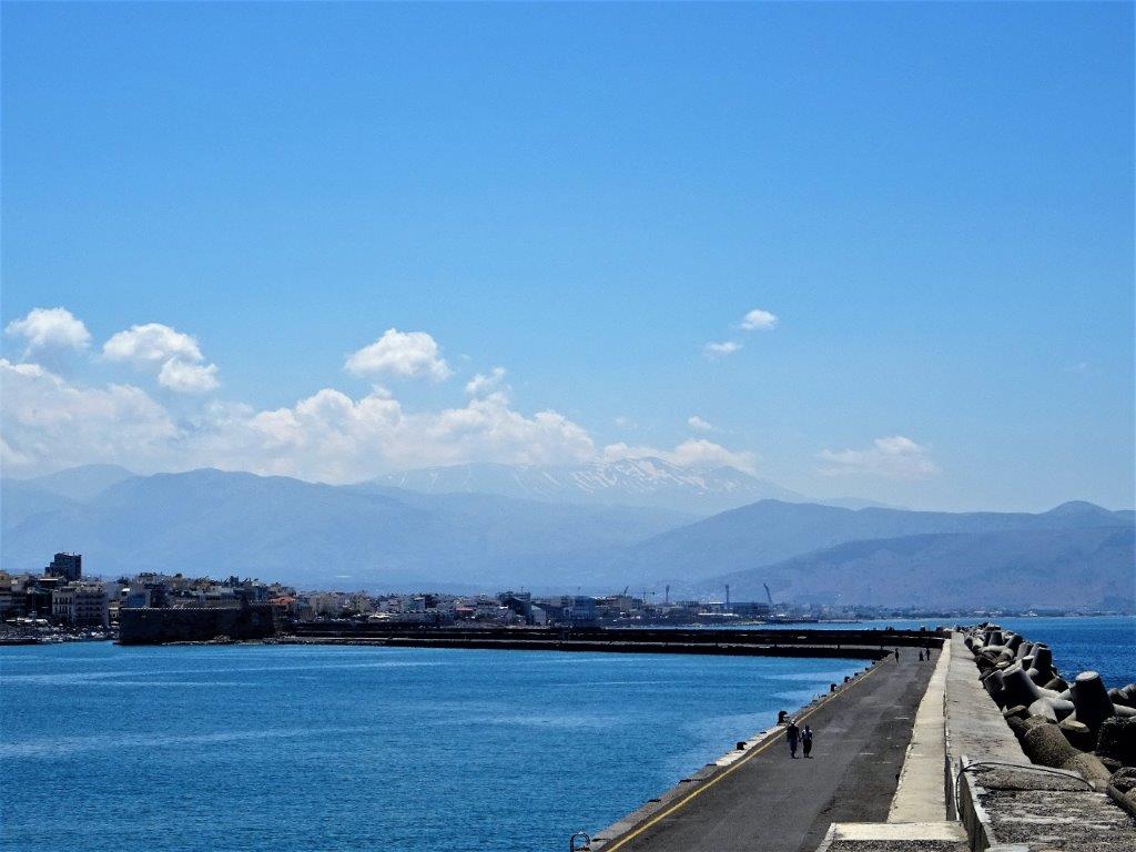 En sväng på bazaren givetvis, ett besök på  turistbyråns InfoPoint (inte mycket att hämta där, inte) och sedan lunch på Amalia’s kitchen. Därefter en promenad som jag varmt rekommenderar: ut på piren. Det svalkar, är en stunds vila från stadsbruset och Iraklio ligger så väldigt vackert med Ida-massivet i bakgrunden. Har du inte besökt borgen så gör det! Den restaurerades för ett par år sedan.