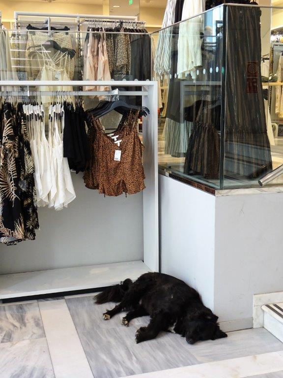 Tänkte gå in om Georgios-parken, men den var rörig. Det verkade som om där pågick en hel del arbeten med att städa, gräva upp träd osv. Synd att det måste göras just nu. Som du vet tycker jag inte om att shoppa, men några butiker var jag inne i. Om inte annat så för att få några minuters svalka för det var varmt! På H&M var jag inte den enda som sökte svalka i butik – se foto!