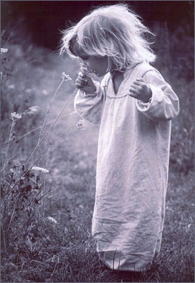 Känner du sommarens dofter? Den där speciella lite lätta luften som finns på sommaren i den tidlösa stunden mellan natt och dag? Visst måste ett nymorgnat, lekfullt barn stanna upp för något så ljuvligt som en blomma och dess doft! Och ljuset som leker i håret och nattlinnet – visst liknar hon en ängel som snart lyfter?