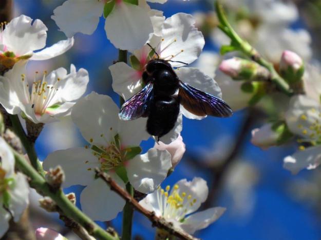 Denna vandringen passade jag också på att leka vidare med nya kameran. Vårt förhållande stärks för varje fototillfälle. När jag närmade mig byn hörde jag surr från ett mandelträd som börjat blomma. Bin hade hittat dit och till min förtjusning fick jag se två stycken ”kretensiska” bin. Det är ett flugfä som jag tycker väldigt mycket om! Den vackert färgglade tjockisen visar när han flyger att allt är möjligt. Jag hade svårt för att få ordning på bi, blomma och kamera. Skit också, tänkte jag och strosade mot Panda. När jag kom hem upptäckte jag att jag lyckats ganska bra med ett foto: