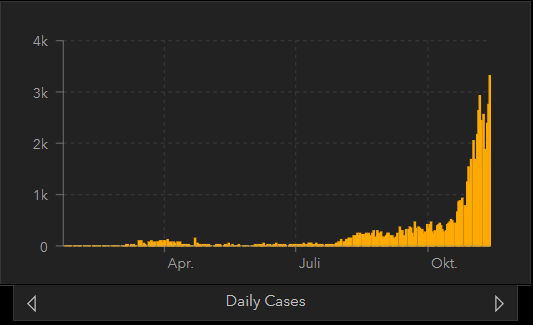 uteckling av dagliga fall är densamma som i de flesta länder, dvs höstens ökning bara accelererar (observera att graderingen på y-axlarna är olika!):