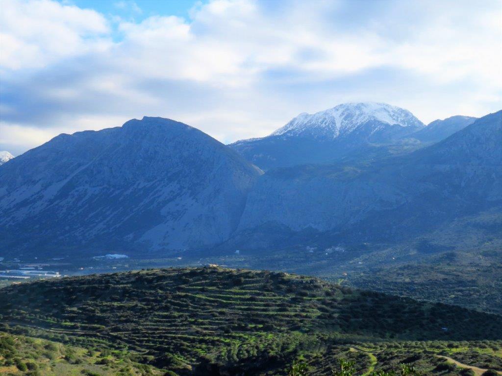 - Snöklädda toppar i Dikti-bergen (västerut).