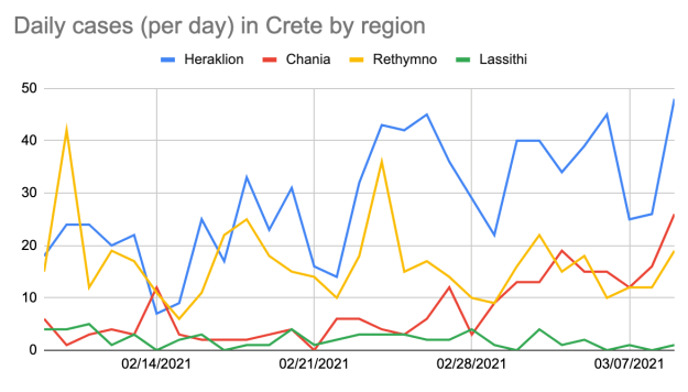 Antalet smittade stiger och det är fortfarande Attika (där Aten ligger) som står för ungefär hälften av fallen. För tillfället ligger smittade strax över 2 000/dag och tycks inte sjunka. Här på Kreta stiger också fallen och graden av smitta i avloppsvattnet – utom i Lasithi vilket nu också uppmärksammas i artiklar. Så här såg det ut 9 februari – 9 mars: