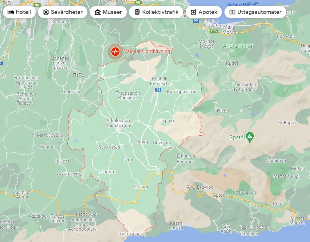 Här ses kommunen Minoa Pediada. Obs! Google har markerat fel plats för stora jordbävningens epicentrum!