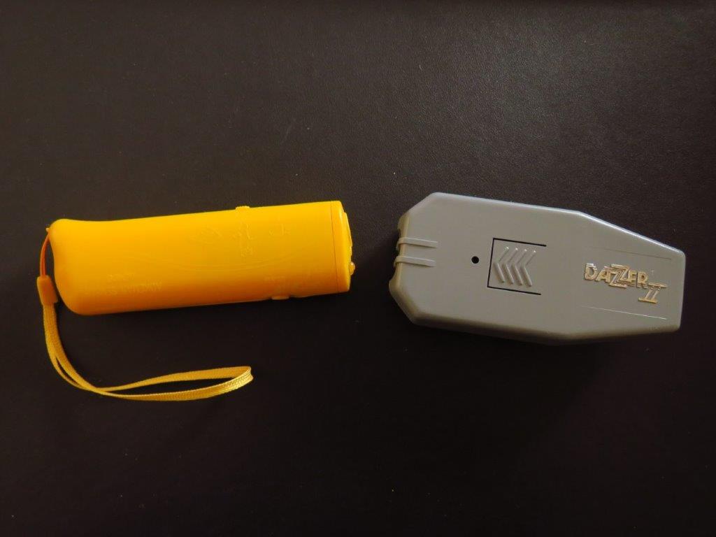 Jag provade först en ”hundskrämma” som jag fick låna (den gula) som var värdelös. Jag köpte sedan en annan efter tips (den grå) som nu varit med ute vid tre tillfällen. Den fungerar. Hundarna backar och drar sig undan. Jag är dock medveten om att inget är 100 %-igt så troligen fungerar den inte på blockerad hund (som ”låst sig” och varken hör eller ser), men de flesta blockerade hundar som jag ser är bundna.
