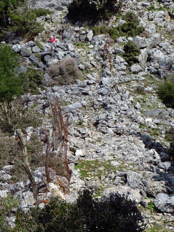 Stigen upp till det bäst bevarade koulés var bitvis väldigt stenig och sista biten upp avstod mitt ressällskap och hittade en fin utsiktsplats så länge. Jag gick upp och därifrån har man utsikt åt alla håll på platån. Mäktigt! Lite borttagning av stenar på vägen upp och runt koulés samt inne i ruinen skulle göra susen!