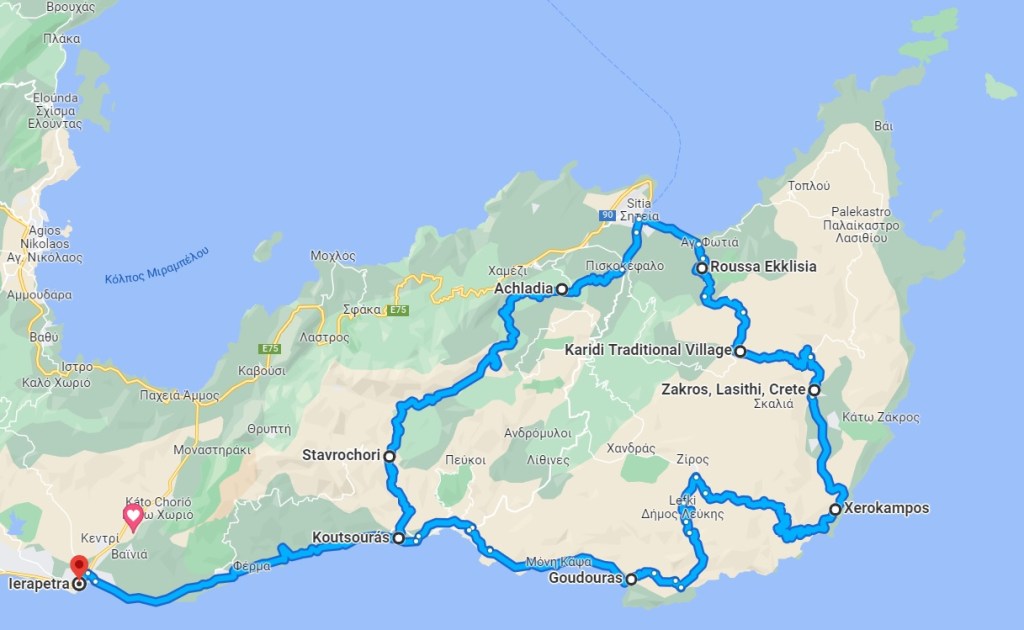Jag fick inte ihop det här riktigt när jag började fundera på grusväg/kustväg, så jag måste backa bandet och korrigera mig 🙃: Den ena gången körde vi till klostret Moni Toplou och palmstranden Vai – vilket ju är en annan riktning. Den andra gången körde vi till Makry-Gialos och en annan väg än den du körde. Vi var även på ett ställe där det var många som surfade, men för stunden har jag glömt vad det heter. Hur som helst var det många vackra vyer 😊.
