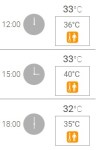Så här kan det se ut i väderprognos på meteo.gr. Det är värdefull information, bl a för mig som vandrar, en indikation hur länge jag kan vara på stranden och hur mycket mer jag behöver dricka.