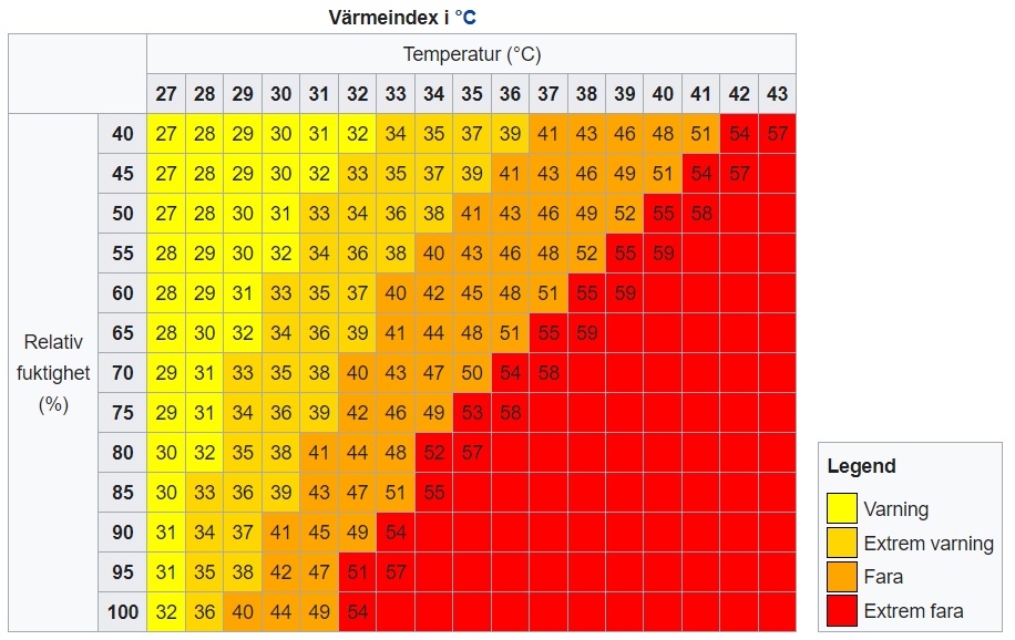 Värmeindex är ett försök att ta fram ett värde som ligger närmare upplevd temperatur. Det kombinerar lufttemperatur och relativ luftfuktighet och får ofta fram ett värde som är högre än temperaturen i luften pga att vi har svårare för att reglera kroppstemperaturen då det vi svettas inte avdunstar eftersom luften är så fuktig. Så här ser det ut schematiskt: