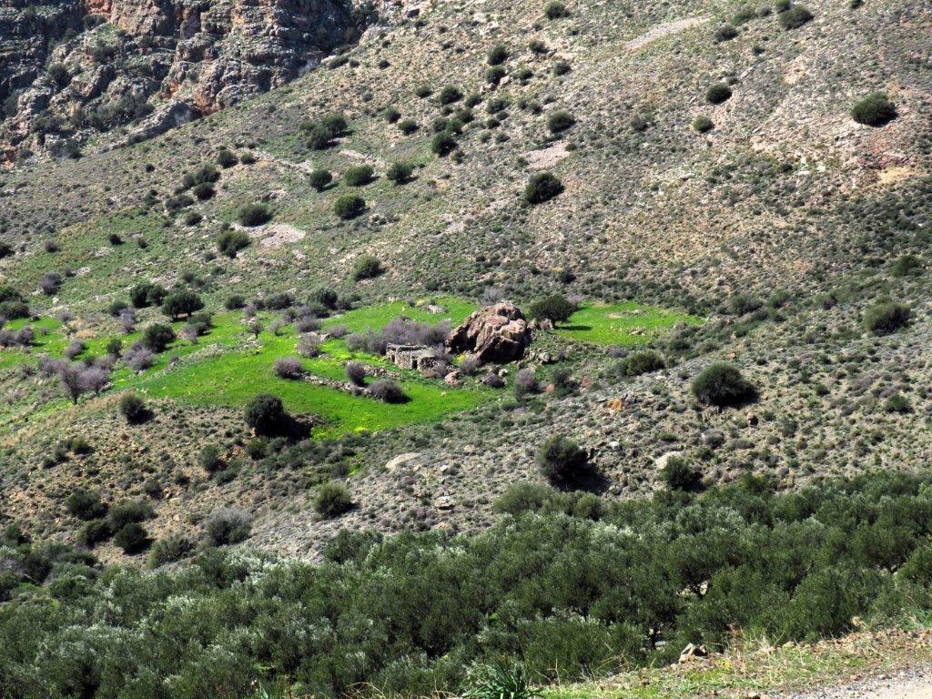 Jag startade med ”kräkbacken” (kort, väldigt brant backe som man ångrar att man gav sig på…). Det var så kyligt på morgonen att vantarna åkte på. Väl uppe på toppen belöning nummer ett: utsikt över platån vid Ano Viannos, bergen och ravinen. Skulle kunna sitta där och njuta resten av da’n!