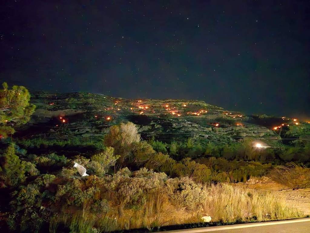 Jag är för tillfället i bergsbyn Mithi (inringat på bilden) som hus- och djurpassare hos en vän som är i England och hälsar på familj. Förra söndagen, den 31 mars, såg jag ett konstigt rökmoln uppe i bergen (en stjärna på bilden) på morgonpromenaden med hunden. Konstigt därför att det inte stämde med hur det ser ut när kvistar eldas i en olivlund. Det visade sig att det var en brand och att den av olika anledningar varit svår att släcka. En anledning var att vi var mitt uppe i en veckas Sahara-damm som lägger sig som ett lock. Värmen har då ingenstans att ta vägen så vi hade höga temperaturer och värme matar eld som vi alla vet.