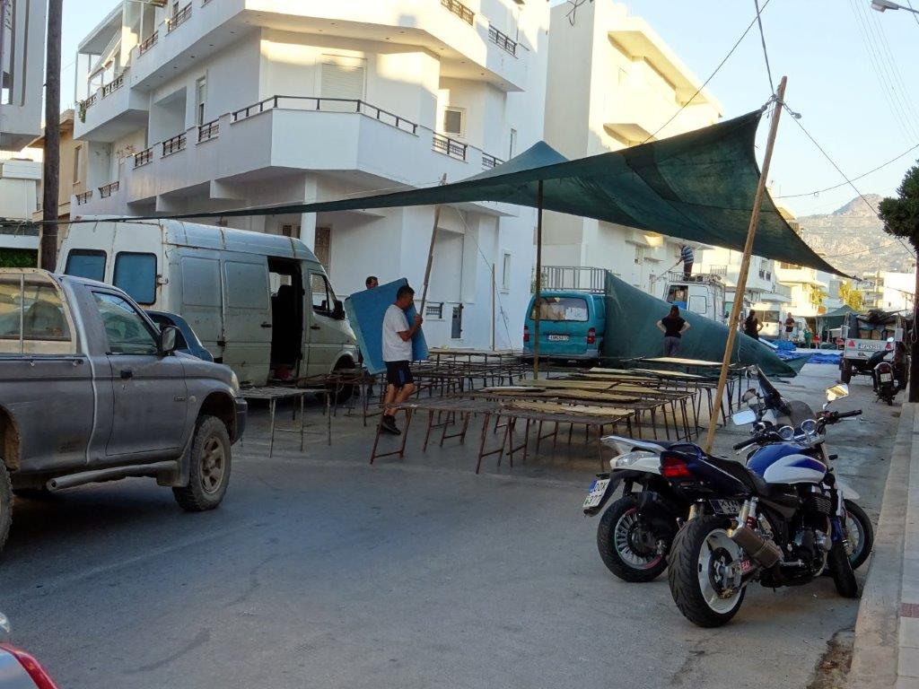 Klockan är snart halv åtta och marknadsstånden håller på att monteras. Mycket som ska packas upp!