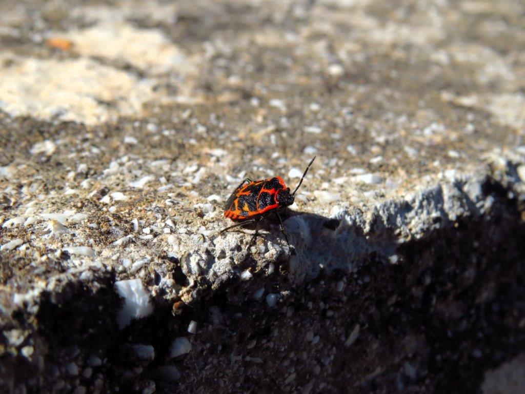 Förutom en mängd katter på ett rastställe i liten by, tupp som gol i fjärran och hundskall från ett hus nere på slätten mötte jag mindre djur som Röda Sköldbaggen (Eurydema ventralis) och ett grävlingskadaver. Jag funderade över det sistnämnda för det var hårt åtgånget, bara skinnet kvar. Slagen av stora rovfåglar som t ex gamar? Attackerad av en stor hund? Ett mysterium. Rediga klor har de i alla fall!