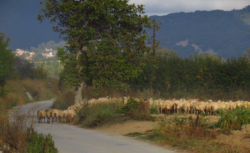 På min förra vandring (som finns här) var det getter som drevs ut på bete efter att de fått frukost. Här var det dags för fåren.