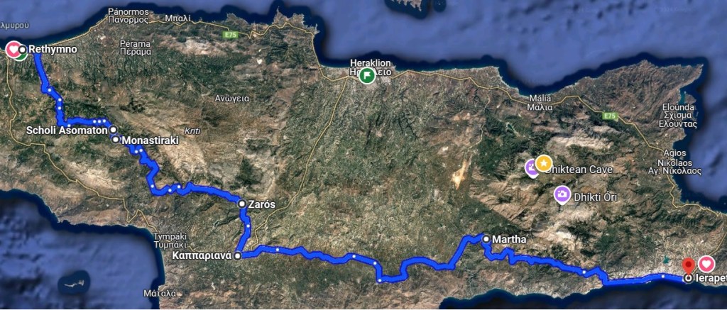 Jag hade beslutat att köra via Amari-dalarna, Zaros och se’n hemåt. Samma sträcka som i mars? Kan verka tråkigt, men sträckan ner till Zaros är lika vacker vår som höst samt att jag ville besöka ett kloster och se spåren efter sommarens stora brand. Jag funderar nämligen på att vandra i området till våren så jag ville se vilka områden som klarat sig undan branden. Så här körde jag: