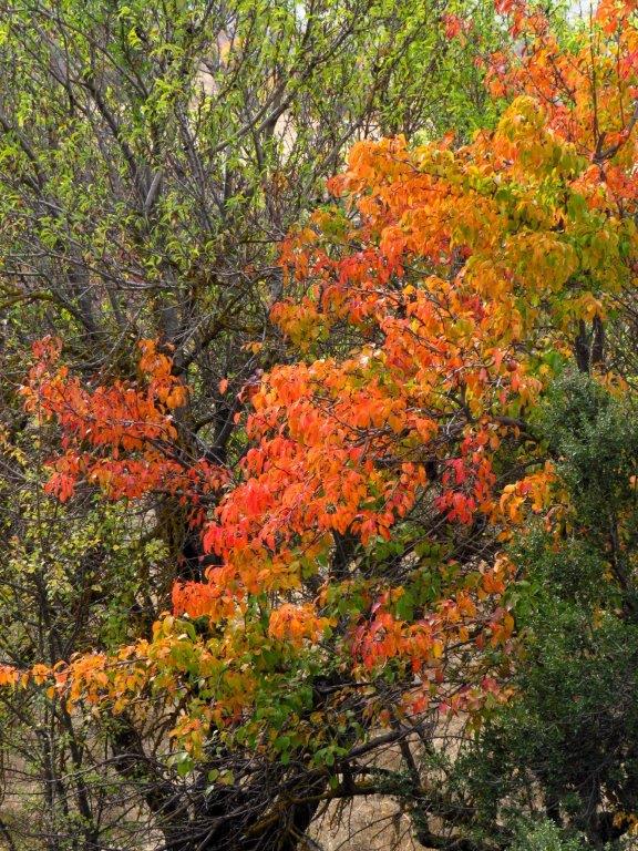 När jag kom upp och tittade ut över platån blev jag glad. Jodå, det fanns höstfärger! Men så tittade jag lite närmare och blev både förvånad och ledsen. Många träd hade inga löv alls, kanske de inte orkat utan gått direkt till vissna löv. Och marken på platån var gulbeige, inte ett enda grönt grässtrå så långt ögat nådde! Normala år så väcker regnen i september och oktober markvegetationen till liv och det blir grönt. Men det här är inget ”normalt” år.