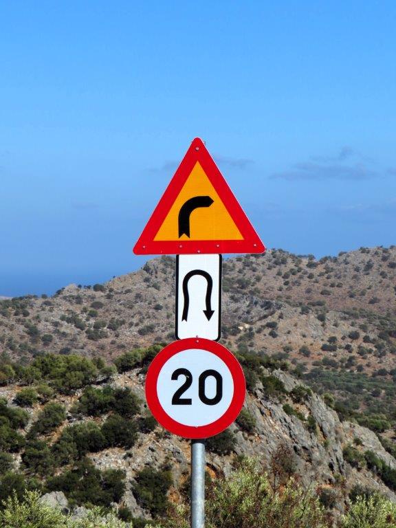 På väg hem såg jag två väldans bra vägskyltar! Till vänster gillar jag den i mitten: hårnålskurva. Och till höger en skylt som borde stå tätt, tätt längs de flesta vägar här på ön!