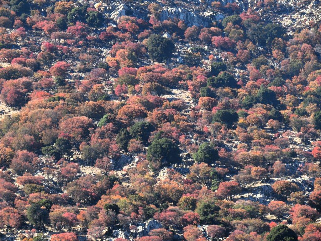 När jag kom upp och tittade ut över platån blev jag glad. Jodå, det fanns höstfärger! Men så tittade jag lite närmare och blev både förvånad och ledsen. Många träd hade inga löv alls, kanske de inte orkat utan gått direkt till vissna löv. Och marken på platån var gulbeige, inte ett enda grönt grässtrå så långt ögat nådde! Normala år så väcker regnen i september och oktober markvegetationen till liv och det blir grönt. Men det här är inget ”normalt” år.