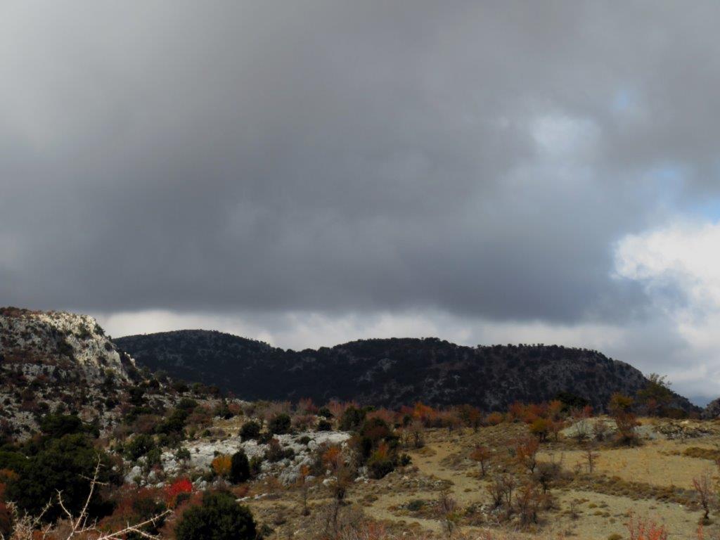 Aj, aj! Det där stora, nästan svarta molnet såg inte bra ut! Och samtidigt lovande! Jag funderade över om grannen, Lasithi-platån, skulle få regn, men molnen drog in över Katharo-platån och upplöstes. Tyvärr.