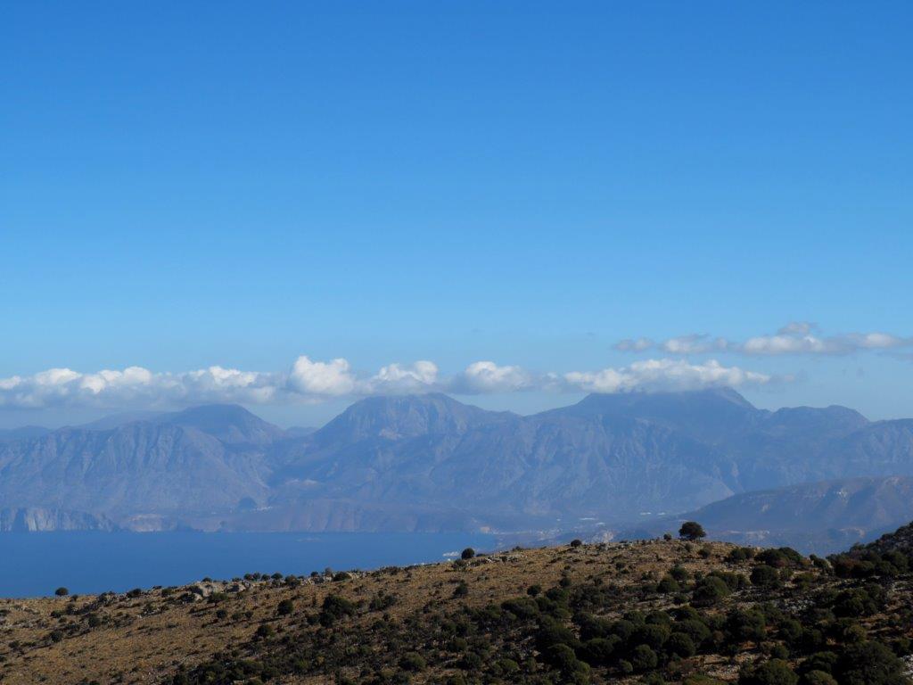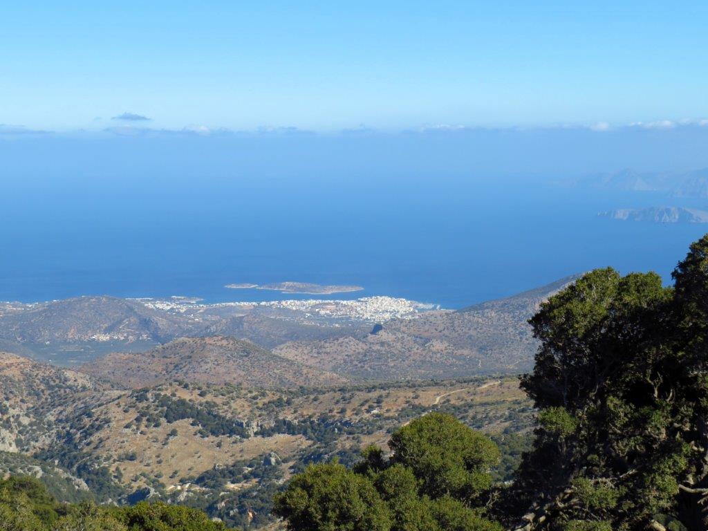 På väg ner får man fantastiska vyer! Förutom bergen, dalar och växtligheten. Till vänster Agios Nikolaos vid Mirabello-bukten och till höger tre toppar (den högsta längst till höger) i Thripti-massivet.