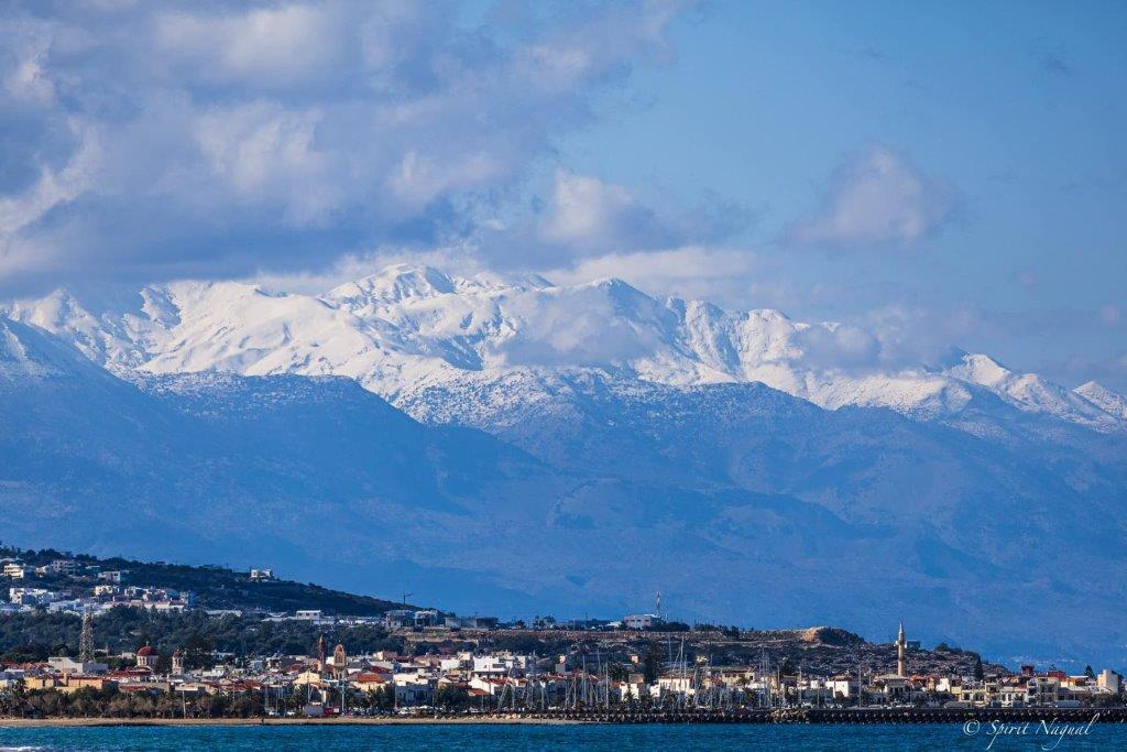 Jodå, toppen Psiloritis syns där vit och grann öster om fyren i venetianska hamnen i Rethymno.
