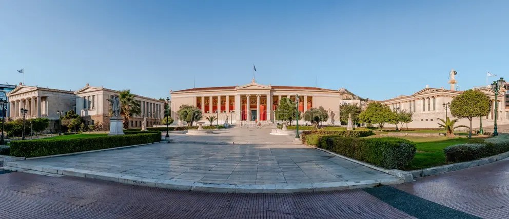 Athenian Trilogy (från vänster till höger: National Library of Athens, University of Athens och Academy of Athens). Kuriosa: två danska arkitekter designade byggnaderna i klassisk stil!