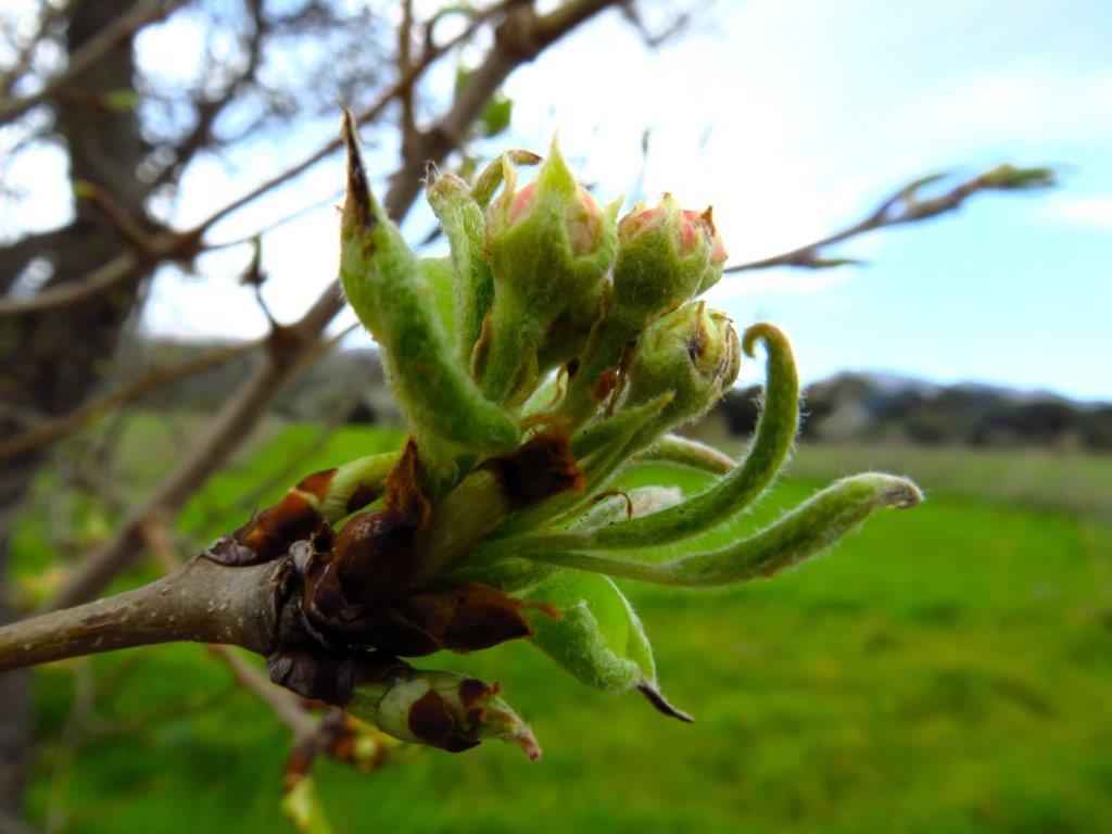 Uppe på platån började hassel och andra buskar spricka och här är det Plymouth-päron som vågat släppa loss: