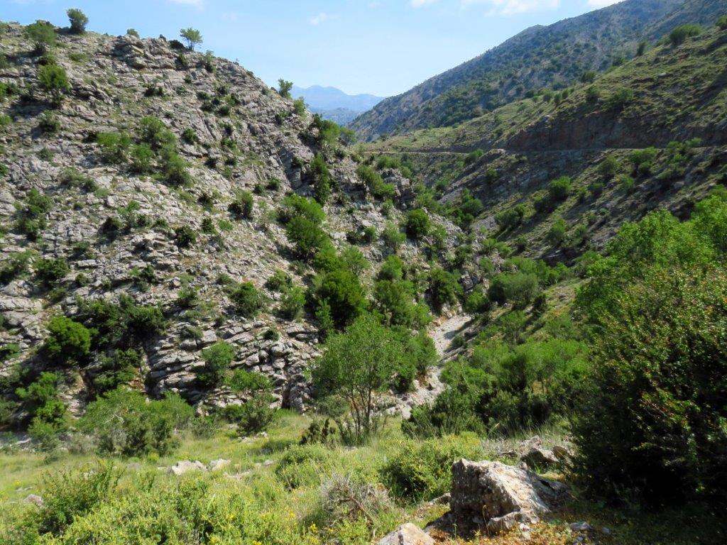 Vägen följer en mindre ravin där getter betar, traskar runt, vilar och iakttar vandraren.