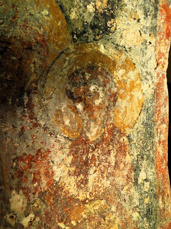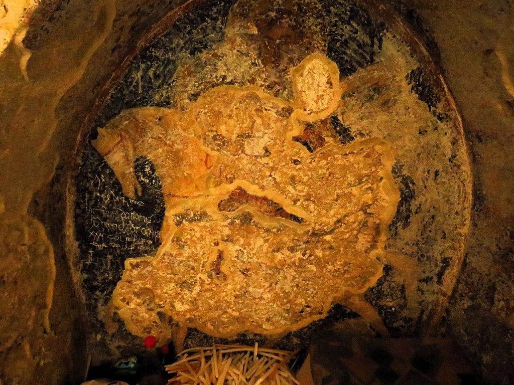 Den gamla delen av kyrkan har väggmålningar som är på väg att försvinna. Håll med om att en av dem skulle kunna vara Agios Giorgos till häst med draken nedanför (ser ut som om det funnits en annan målning där först!).