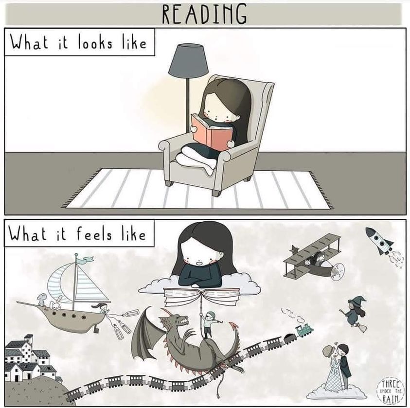 Det magiska med böcker är ju alla de människor man träffar och alla platser man besöker. Allt man får uppleva utan att lyfta ändan ur soffan och som man aldrig hunnit i levande livet!