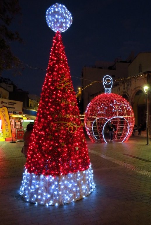 Den 17-18 begav vi oss, tre damer, till Iraklio för att njuta av dekorationer, ljus och julsångskonsert. Givetvis blev det också god mat och dryck! Sov över på El Greco Hotel, middag på Antipodas och lunch på Home. Dryck lite här och där när det passade in i strosandet. Vi hade otrolig tur med vädret! Vinden hade lagt sig och lokala regnskurar höll sig borta.