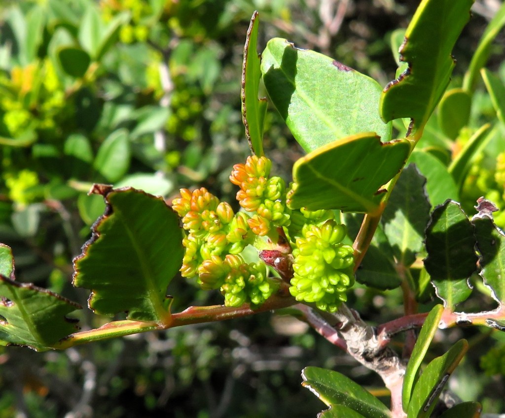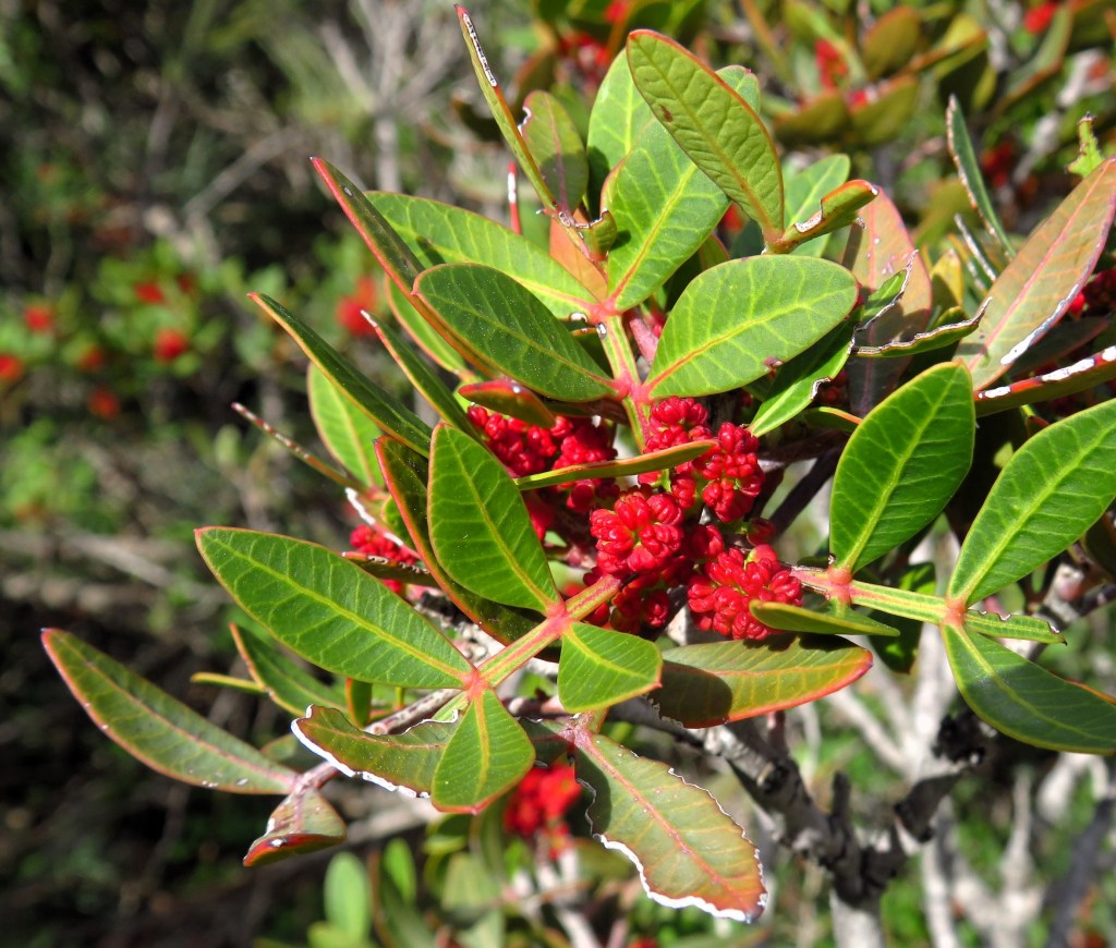 Men det finns tecken på att växter ligger i beredskap! Här Mastix till vänster och Johannesbröd till höger – knoppar som väntar på att få brista:
