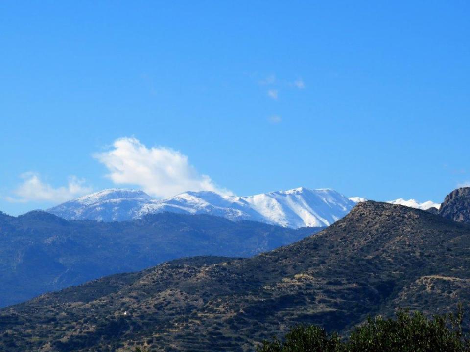 Snöklädda toppar i Dikti-bergen (västerut).